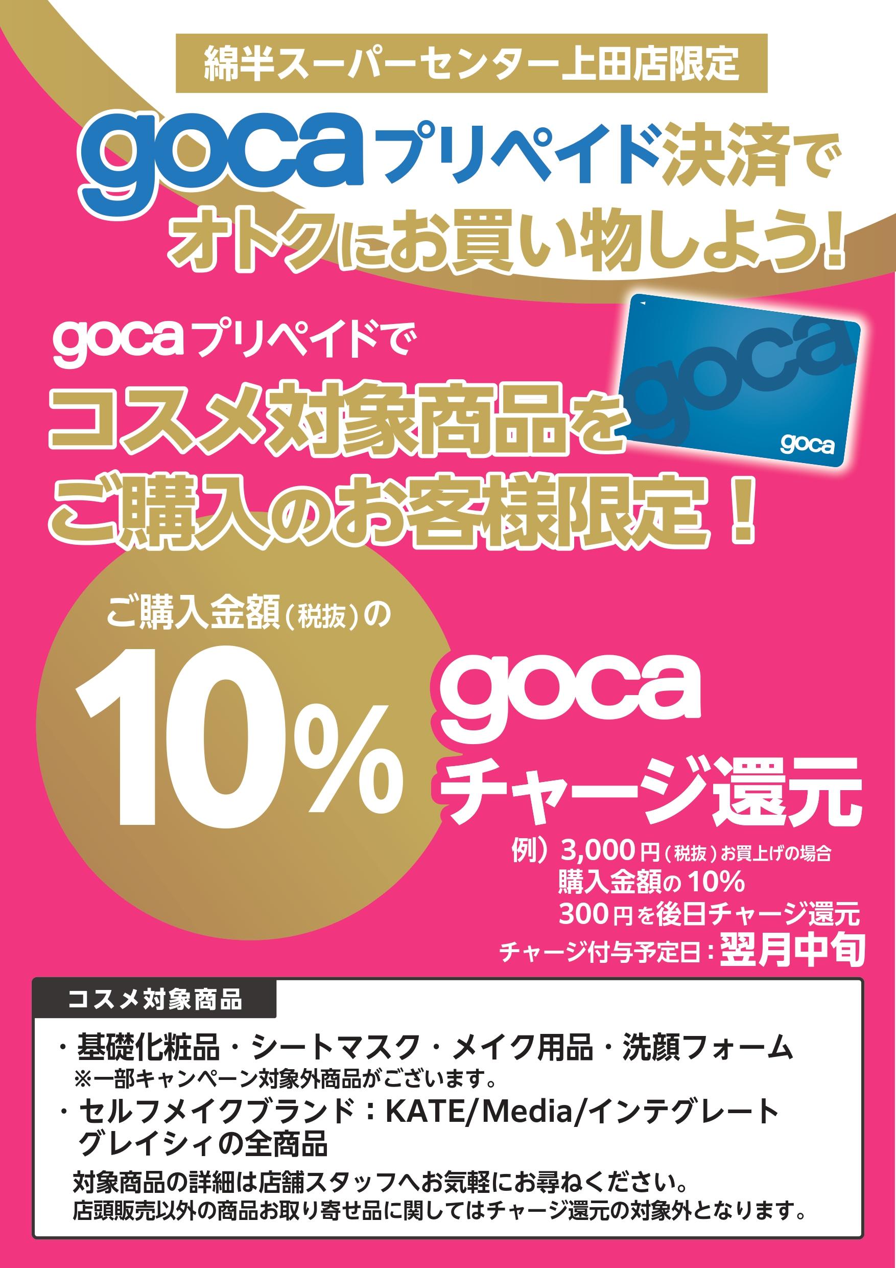 コスメ対象商品をgocaプリペイドでご購入いただくと、ご購入金額(税抜)の10%をチャージ還元!チャージ付与予定日:購入日の翌月中旬