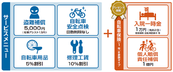 本パックは、万が一の盗難や事故に備えた補償をはじめ、安全点検や修理割引など、多彩な特典をお得な価格でご提供いたします。