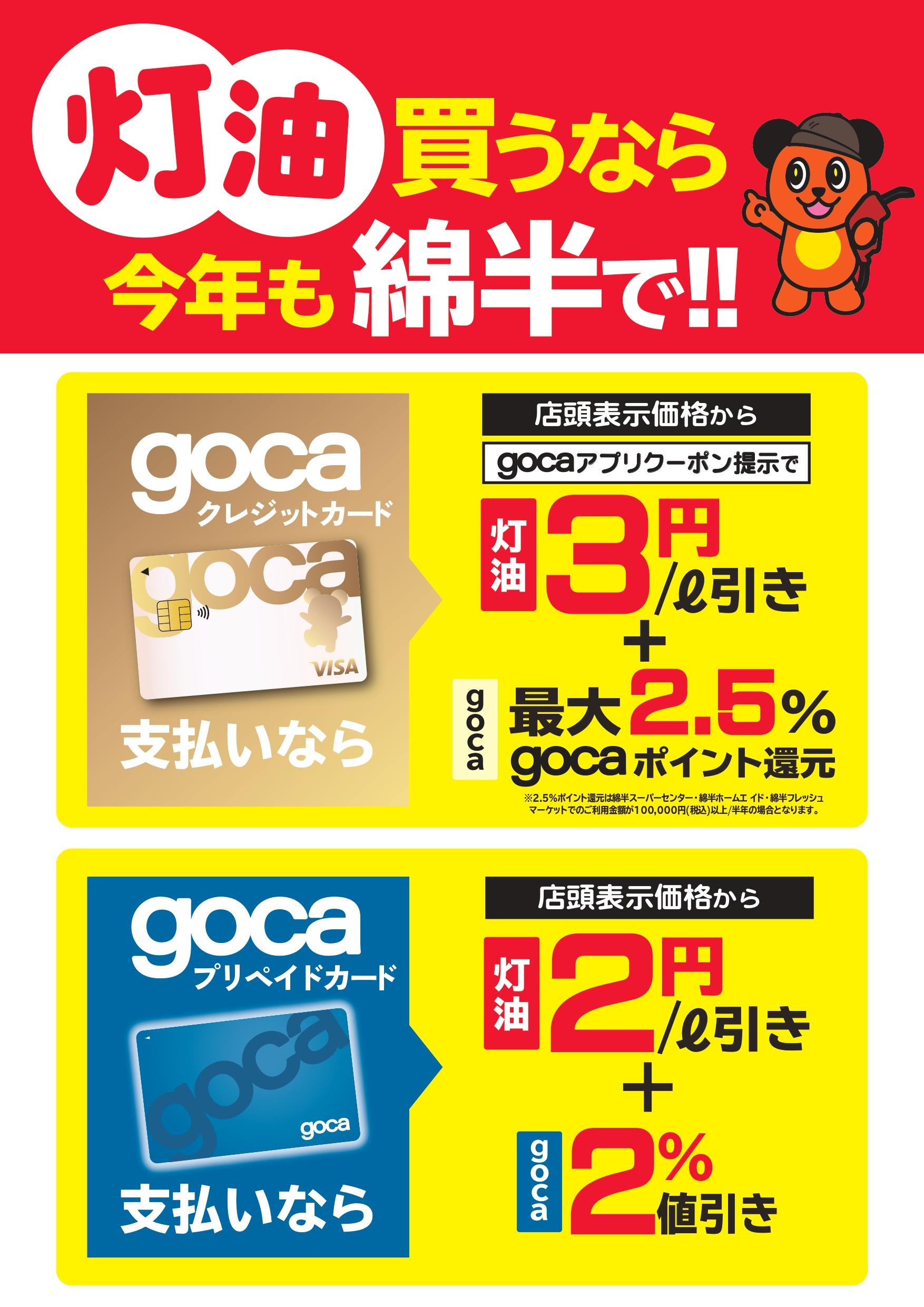 ※灯油値引きクーポン(1ℓあたり3円値引き)はgocaクレジットカード会員様限定です。gocaプリペイドカード支払いを含むその他お支払方法の場合ご利用いただけません。