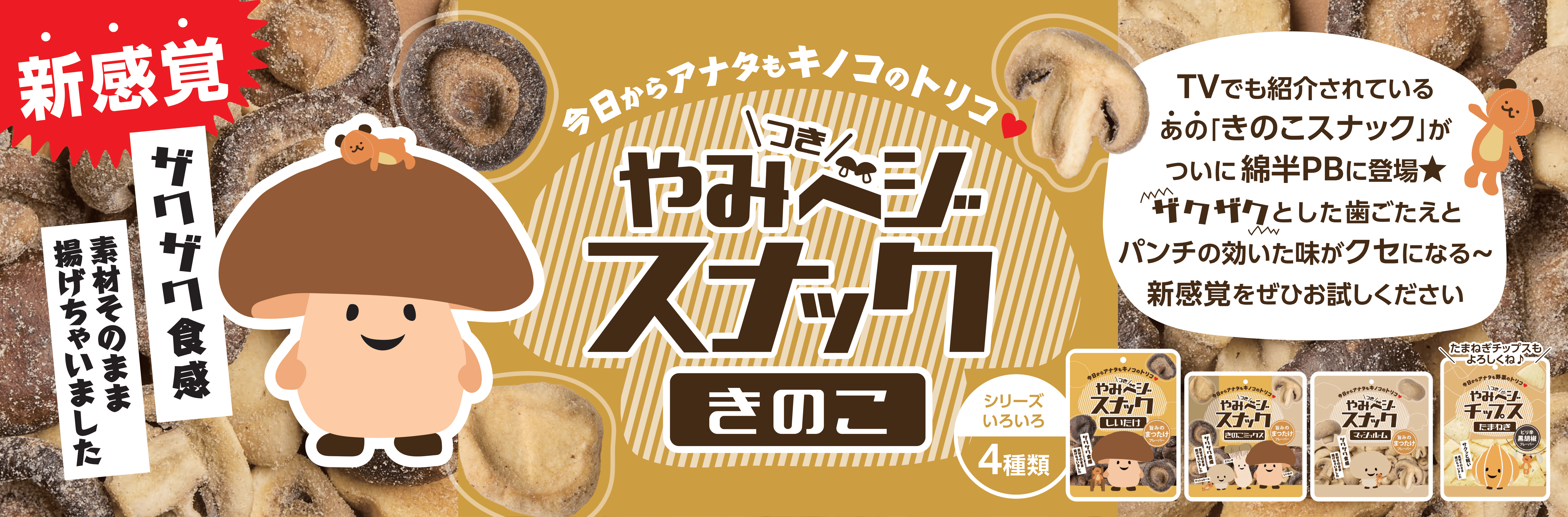 TVでも紹介されているあの「きのこスナック」がついに綿半PBに登場!